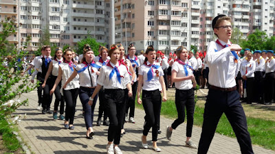 класс идёт строем, чеканит шаг и исполняет строевую песню. Классы подготовили